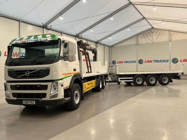 2011 Volvo FM 450 6x2 Rear Lift Day Cab Flatbed Brick Grab with Tri Axle Drawbar Trailer. Hiab XS 144 Crane with Brick Grab. 12 Speed Manual Gearbox. Radio/Stereo. Excellent Condition. We can organise shipping to ...